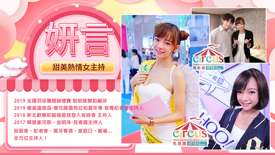 ☆中華職棒 Lamigo TV 特約主播 ☆巧虎快樂版-叮噹姊姊 ☆第八屆 阿甘盃路跑嘉年華 代言人 ☆中華職棒啦啦隊Lamigirls一軍成員,發行寫真單曲 獨一無二的閃爍 ☆韓星見面會-姜河那、金明洙、前進 主持