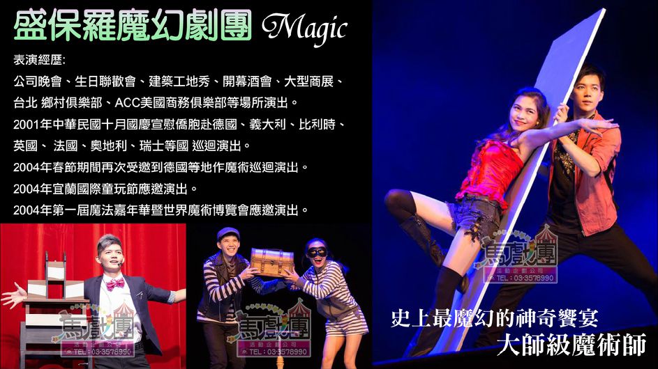 表演經驗超過十年的專業魔術團隊 超過百萬人見證奇蹟 魔法橫跨亞洲、歐洲、澳洲 演出足跡超過15個國家以上。擁有十年以上的魔術表演及豐富的教學經驗 舞台風格詼諧逗趣,擅長2人組及以上大道具魔術搭配