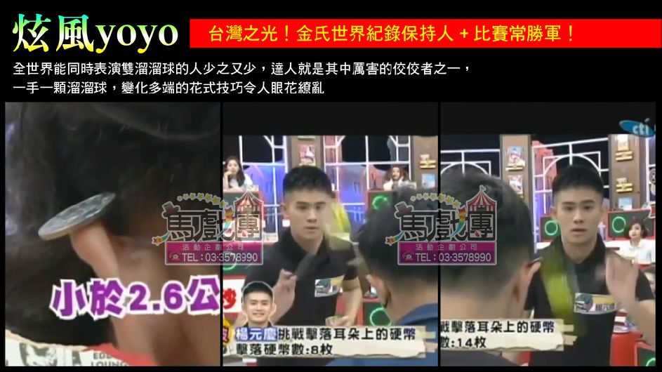 全世界能同時表演雙溜溜球的人少之又少,達人就是其中厲害的佼佼者之一,一手一顆溜溜球,變化多端的花式技巧令人眼花繚亂。將溜溜球及扯鈴結合,利用雙手讓扯鈴在繩圈內來回穿梭,這是 全新的扯鈴表演,同時也是達人最令人讚歎的表演節目,曾在國 宴上獲得一致好評。