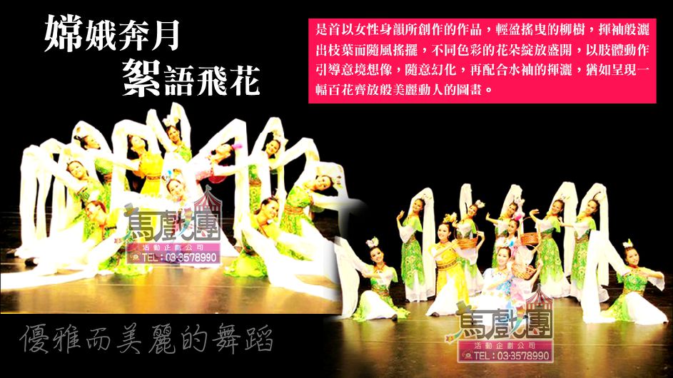是首以女性身韻所創作的作品,輕盈搖曳的柳樹,揮袖般灑出枝葉而隨風搖擺,不同色彩的花朵綻放盛開,以肢體動作引導意境想像,隨意幻化,再配合水袖的揮灑,猶如呈現一幅百花齊放般美麗動人的圖畫。